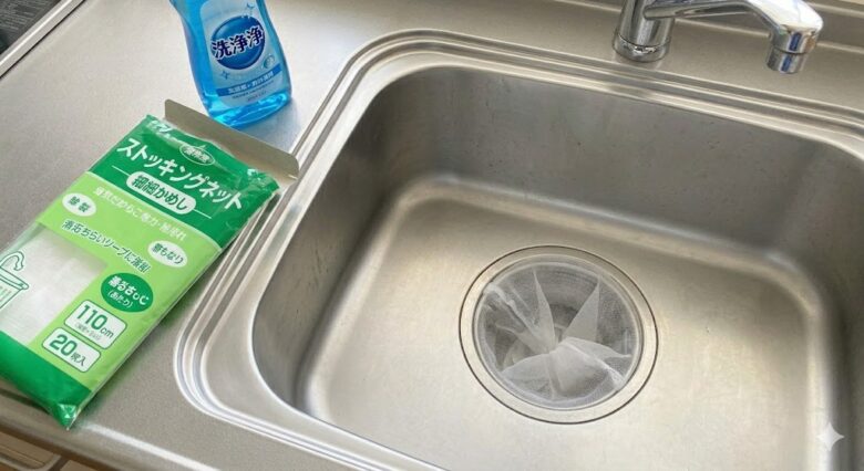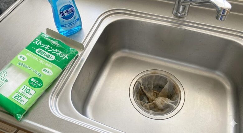 排水口には古いネットが設置されている状態。カウンターに新しいストッキングネットと食器用洗剤を用意する。
