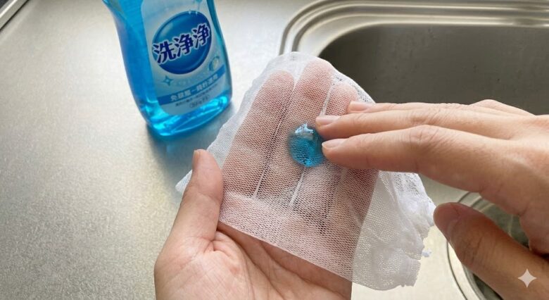 古いネットを捨てたら、設置前の新品ネットを1枚取り出して直接洗剤を垂らす。ここがこの方法の最大のポイント。